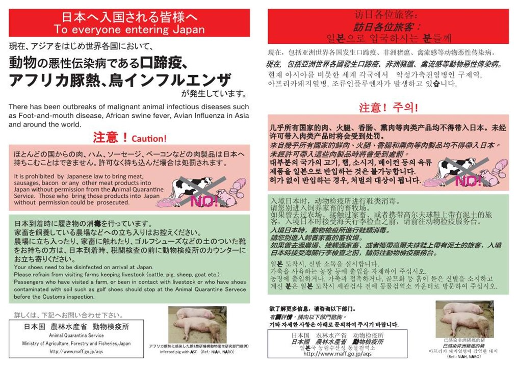 中国等におけるアフリカ豚熱発生及び肉製品等の持込禁止の注意喚起として、広報ポスター(日本語、中国語、英語、韓国語等)を、CIQ関連部署、空港ビル会社等と連携し、中国等からの国際旅客便やクルーズ船、フェリーなどが就航する空海・港のターミナル等に掲示しています。