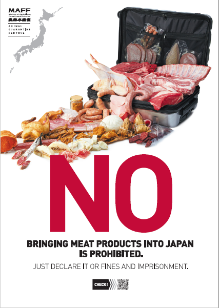 (日本語訳:日本の動物検疫所が訪日外国人旅行客に注意喚起。海外からの肉製品の違法な持ち込みは罰則の対象です)
