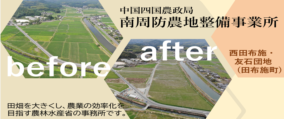 南周防農地整備事業所は、山口県東部の柳井市、熊毛郡田布施町および光市にて、狭小や不整形な効率的な営農が困難な農地等を対象にほ場整備(農地の区画整理、大区画化)、暗渠排水整備(農地の排水性の向上)を実施するとともに、老朽化したため池改修のため農業用ため池整備を一体的に取り組む農林水産省の事業所です。 |