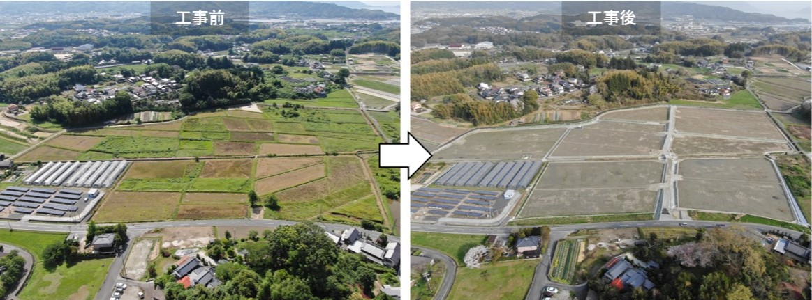 区画整理工事は、小区画不整形な農地の大型区画化を図り、併せて用排水路及び道路を整備して、生産性・効率性を高める効果があります。
