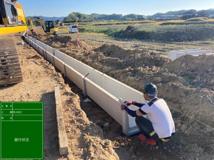 造成した道路、畦畔に合わせ、用排水路等の構造物を設置します。