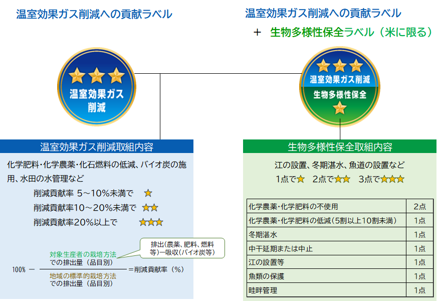 温室効果ガスの削減への貢献ラベルと生物多様性保全への貢献ラベルを加えた2種類のラベルがあります。