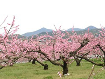 香川県内のももが開花最盛期を迎え、園地は鮮やかなピンク色に染まっています。