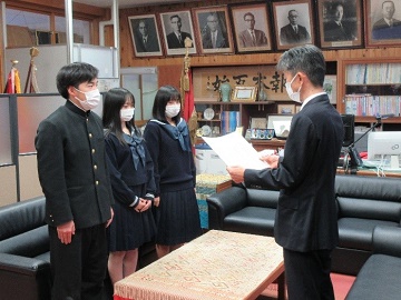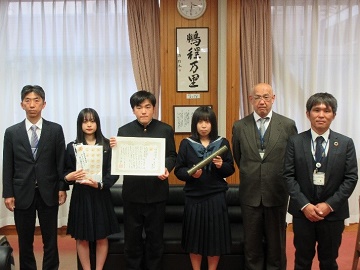 令和3年12月23日、高知商業高等学校ジビエ商品開発・販売促進部(ジビエ部)に対し、中国四国農政局「ディスカバー農山漁村(むら)の宝」の選定証を授与しました。 |