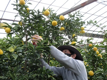 高知県の柑橘産地である香南市香我美町山北地区を中心にJA高知県香美地区管内で、3月上旬から温室小夏(日向夏)の出荷が始まりました。「JA高知県香美地区果樹部温室小夏研究会」では、10人の生産者が約1.8ヘクタール栽培しています。JA高知県担当者によると、今年は冬の寒さが厳しく降雨が少ない等の気象条件により、例年に比べて糖度が高く、大変良い品質とのことです。 |