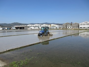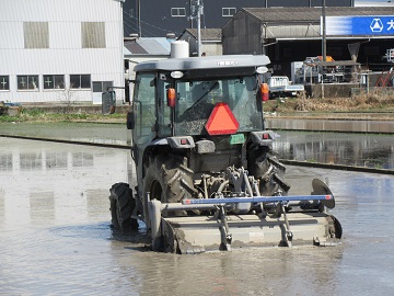 春の暖かい日差しの中、高知市東部の早期米に取り組む水田では代かき作業が始まっています。 |