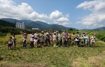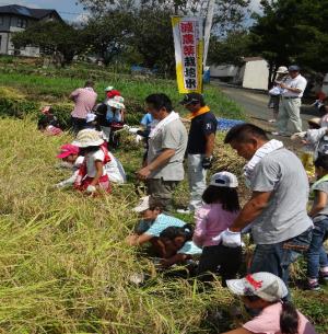 当日は曇天で途中から小雨も降り始め、コンディションが悪い中でしたが、大人25名・子ども28名の参加者が、6月に田植えをした圃場において、鎌を持ち手作業で稲刈りをしました。