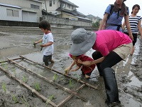 今年は梅雨入り後の雨も多く、開催が心配されましたが、何とか雨の合間に田植えをすることができました。素足で田んぼに入るのが初めての子どもたちが、わいわい、キャーキャーとぬかるみに足をとられながらも、昭和40年頃まで使っていた田植え定規(田植えの際に、縦・横を一定間隔にそろえるために用いる道具)を使って、手植えで田植えを体験しました。