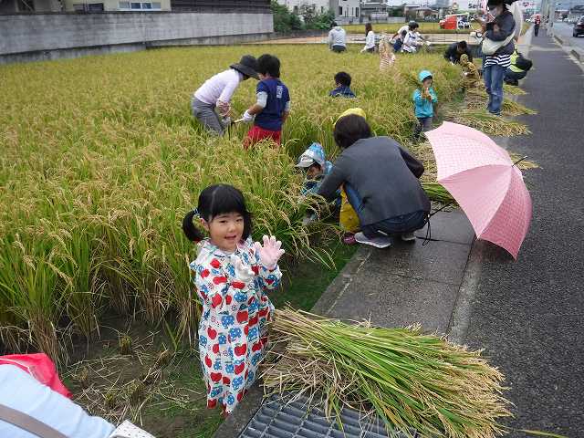 田植えの時から参加した子どもたちは、自分が植えた場所の稲の成育状況を確かめるなど、愛着を持って稲を刈っている姿が見られました。刈りとった稲を積み上げたり、迷路を作って稲の間を通りぬけるなど参加者は親子で思い思いに楽しんでいました。
