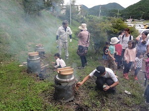 初日、子ども達はTVもお菓子もない自然の空間でテント設営をし、皆で火を起こしてかまどでご飯を炊き、カレーを作りました。お米は地元の「相川米」、カレーの肉は「土佐の赤牛」です。自然とふれあい、友達とのにぎやかな食事に食が進みました。また、川ではあまご捕りや、地元老人会のご協力で班ごとにイカダを作り、イカダ競争をしました。子ども達の笑顔と元気な声が飛び交いました!