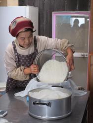 そして、三田慧子氏の指導の下、蒸しあがった米に麹菌をふり、まんべんなく菌が回るように良く混ぜた後、発酵が進むように布袋で包んだ上から、紙袋で包むという、米麹作りの一連の作業を体験しました。