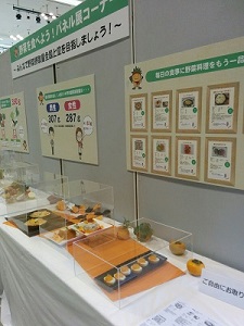 香川県の野菜摂取の現状は、60グラム不足しているので、その不足分がどのくらいの量なのか、人参、きゅうり等を使って展示しました。