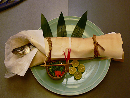 Sea bass gains fat and becomes even tastier from late autumn through early winter. The fish used to be an everyday food for the commoners of Izumo. Then came Matsudaira Harusato, the 7th lord of the Matsue Domain, popularly known as Matsudaira Fumai, who is credited with reviving the Matsue Domain. The lord came across some fishermen roasting sea bass on a fire near Lake Shinji and wanted to try it out. Thinking they could not dare to present an ash-coated fish, the fishermen wrapped it in hosho (fine-quality Japanese paper) and offered it to him. Lord Matsudaira loved the fish, saying, “This is so delicious!” The dish, which came to be known as “sea bass broiled in hosho,” is still served as a treat on festive occasions.