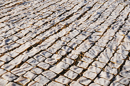 The “frozen konnyaku” is made during the severe winter season from December to February. Arrange the konnyaku one by one on the straw spread in the field and pour water over them. Then the konnyaku is completely frozen by the cold air at night. The next day, when they are thawed by daytime temperatures, pour water over them again at night. This process is repeated and will be completed in about half a month. As it requires great care, it has been in decline in recent years and has become an extremely precious ingredient.
