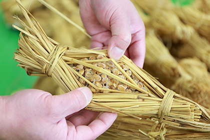 Mito City is famous for its natto (fermented soybeans). Locals say it originated with Minamoto no Yoshiie, a warlord of the Heian period (794 - 1185). When Minamoto no Yoshiie visited Mito, his retainer wrapped boiled beans, which were used as horse fodder, in straw, and it became stringy. Yoshiie was wary about trying it, but raved about its taste. “Beans served to the Shogun,” or “natto,” quickly spread to farmers in the area. Each grain of natto wrapped in rice straw is soaked in the aroma of straw and has a rich flavor. Local businesses, from the oldest to the newest, have elaborated their own tastes and pursued their own unique flavors.