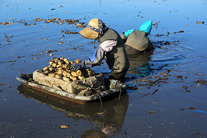 In recent years, “clams of the Sea of Kashima” have become famous throughout Japan. Its Japanese name is “Korean hamaguri (Asiatic hard clam)” and they live on the sandy bottom of the sea up to a depth of 10 meters. They can be more than 10 cm in size and the shells are shiny and beautiful. The area accounts for about 60% of the country’s clam production, and at the beginning of the Heisei period (around 1990), it boasted a catch of about 1,000 tons. However, the number has been decreasing and is currently less than 100 tons. Local fishermen’s cooperatives systematically fish and protect the clams by setting up protected areas.