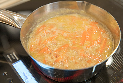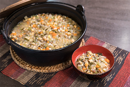 “Kenojiru” is one such regional dish that people are very used to enjoying at home. It is full of ingredients like daikon radish, carrots, butterbur, burdock, and beans and is a classic dish served at Little New Year (January 15th). The soup stands out from others in that all the ingredients are diced. People say that “ the finer you chop the ingredients, the better the soup tastes.” If lots of wild vegetables are added, the soup turns a blackish color, which also a sign of a delicious “kenojiru.” The soup is all the more delicious when you think about the time and labor the cook has put into each bowl.