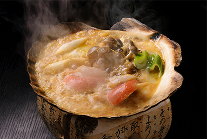 “Misokaiyaki” (stewed scallop cooked in a shell) is a hearty way of eating that is typical of fishing towns. Scallop shells, which are used in place of a pan, are filled with “dashi” stock, miso is mixed in until it dissolves, and the dish is finished with egg on top. Long ago, all households had shells on hand. There are far fewer such households these days, but the delicious flavor of scallops is no different to that of the old days.