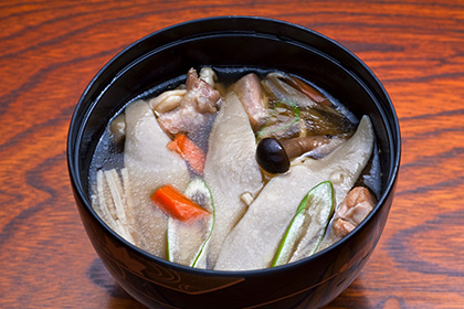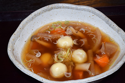 Mamebujiru soup is another flour-based dish. Dumplings made of wheat flour are filled with walnuts and brown sugar and are simmered together with vegetables in a soy sauce-flavored broth to create a dish that offers both sweet and savory flavors. The dish made an appearance in the drama series Amachan and has become popular among tourists.