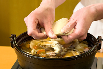 The most representative shitinemono dish is hittsumi. Flour is kneaded with water into a dough which is then rolled thin and torn by hand into small pieces. These pieces are boiled in a broth together with ingredients such as chicken and vegetables. In this area, the expression for “tearing by hand” is “hittsumamu,” and this is said to be the origin of the word “hittsumi.” Today, this dish is eaten all over the prefecture. Ingredients used depend on the season, the region, and the household doing the cooking. In mountainous areas, river crabs and river fish are used, while in coastal areas minced saury is used as an ingredient. These days, the dish has also been modified into different modern styles, with curry flavored hittsumi. and hittsumi served in Western, Chinese, or dessert styles. Hittsumi is widely loved by people of all ages and can now be considered the dish of the people of Iwate prefecture.