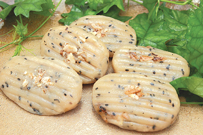 The most representative of these dishes is mameshitogi. “Shitogi” means to mash. Mameshitogi are unbaked cakes made of beautifully green soybeans that have been boiled, mashed, and then kneaded in combination with rice flour and sugar. Mameshitogi were made as offerings to the mountain gods, in the fall at niwa-shimai, an event that marked the end of the busy farming season, and in spring, as food to attract nightingales.