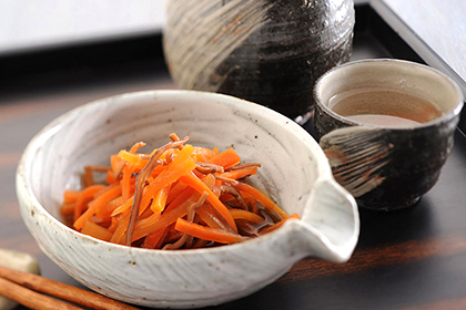 Ika-ninjin (squid and carrots) is a local side dish eaten even in the northern areas of Nakadori. It is made by chopping up surumei (dried squid) and carrots into small pieces and marinating them in a sweet and spicy sauce and mirin sauce. The texture of the carrots and surume and the sweet dip make this dish addictive. It also goes well with rice. Today, ika-ninjin continues to be loved in various forms and is enjoyed as a snack flavor or as kakiage (mixed vegetable and seafood tempura), takikomi gohan (seasoned rice), and other arrangements.
