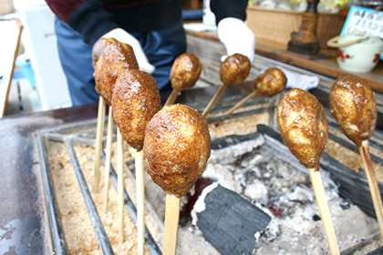 Shingoro is a dish made by mashing junen and adding miso, sake, mirin, and other seasonings for the sauce, coating it on mashed rice, and baking it. It is said that it was named after a certain young man. Shingoro could not eat mochi on New Year's, so he mashed and balled up rice instead, dipped it in junen-miso, and baked it, making his mother happy, hence the dish's name. This local dish with a simple and gentle flavor is especially eaten in Shimogo Town and Minamiaizu Town.