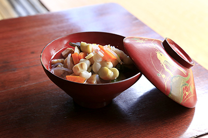 Kozuyu is a local dish served in a teshio-zara (a shallow Aizu lacquerware) with various ingredients such as kikurage mushrooms, bracken, and taro cooked in scallop soup stock. It has been eaten for over 100 years. In the past, it was served in two separate bowls: "ichi no ju" and "ni no ju" or "ichi no tsuyu" and "ni no tsuyu." However, since 1985, it is now served in a single bowl as kozuyu.