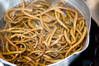 Igoneri is another local dish handed down mainly on Sado Island. Its only ingredient is a seaweed called igokusa. Igoneri is made by boiling and dissolving dried igokusa, then cooling and hardening it. After cutting the seaweed into noodles, dip them in men-tsuyu and enjoy this tasty dish with a subtle aroma of the sea.