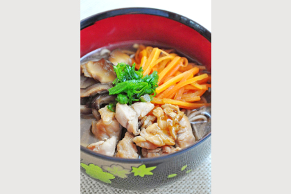 In the same city, you can also find Gotemba Soba, a soba made without water, by blending wild yams and potatoes, before taking chicken stock and simmering carrots, shiitake mushrooms and chicken for the broth. It's often eaten during official events over the New Year holidays.