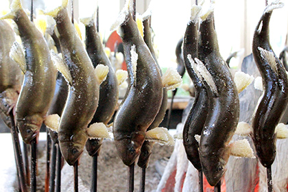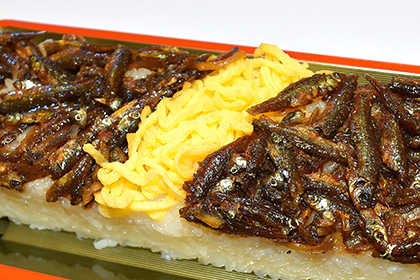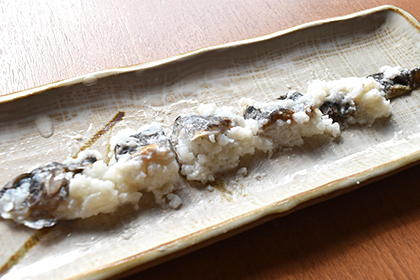 Another river fish dish is moroko sushi. The dish is prepared by laying out vinegared rice in a special sushi box, then arranging sweetened, boiled moroko (a freshwater fish in the carp family that grows to around 10cm in length) then pressing it to make pressed sushi. The dish is served at festivals and in the New Year’s holidays, as well as memorial services where many people gather.