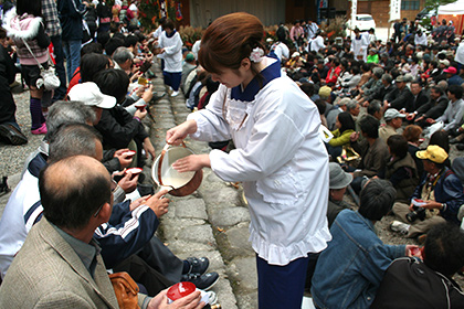 During the festival, unrefined doburoku sake is given as an offering, while festival-goers dance to traditional folk songs. People in attendance are then also offered doburoku sake to drink.