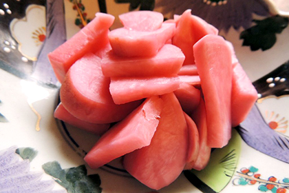 The Hida area is ringed by high mountains, and it experiences freezing colds and frequent snowfalls in winter. In 1918, Takayama-shi, a town in Hida, saw the discovery of a red, mutated strain of the hachiga turnip, which was cultivated as the “Hida beni kabu (red turnip),” with the pickled end-product called the “red turnip pickles.” In an era when it was difficult to get your hands on fresh vegetables, these were a valuable form of preserved food for getting through the long winters in snow country.