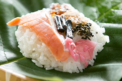 Appearing in pastoral poems depicting the bright early summer greenery ringed in mountains, hoba sushi is a local dish made with vinegared rice wrapped in magnolia leaves that originated as a form of portable food for laborers working in the fields and mountains during the agricultural busy season. Magnolia leaves have anti-bacterial properties, making them precious in a warm, humid period when concerns over food rot were prominent, in addition to which the sushi being wrapped in leaves meant that it could be eaten without dirtying one’s hands, even without chopsticks. This made hoba sushi a key piece of folk wisdom in an era without means of preserving food such as refrigeration, and when handy utensils were unavailable.