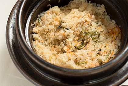 Professor Horikoshi said that "Lake Biwa owes itself to its culinary culture." "Amenoio Gohan" is another dish made possible by the blessings of Lake Biwa. In autumn, large Biwa trouts weighing 1 to 2 kg travel upstream to lay eggs. It is said that in the old days, they were caught by hand, put on top of rice, and cooked whole in a large pot.