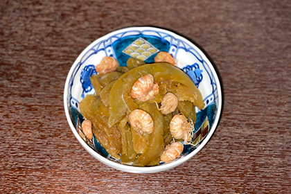 Then, after the Senshu Mizunasu is slowly pickled in a bed of salted Nuka used for pickling, known as "Nukadoko," it can be stewed together with shrimps to prepare a dish known as "Jako Goko." "Jako" refers to the shrimp, and "Goko" to the pickles. It can be said that this dish, which makes use of the shrimps caught in the nearby sea and the specialty Mizunasu eggplants of the region, is a unique local dish of Senshu.