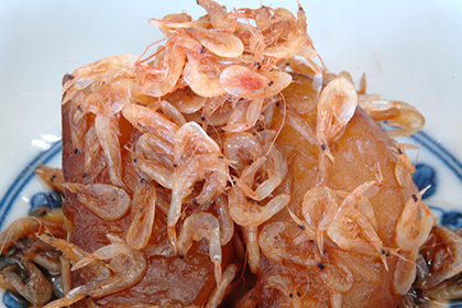 In addition to mamakari, the allure of Okayama Prefecture’s local cuisine is in its use of the bounty from the Seto Inland Sea. In the spring and summer, a small fish called ishimochijako is caught in the Seto Inland Sea and used to make “fried ishimochijako”. A small shrimp called akiami, which is a member of the same family as sakura shrimp, comes into season in early autumn and is used to make “ami and daikon boiled in soy sauce”.