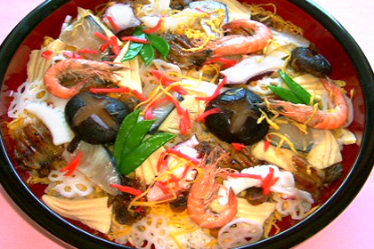 In the Bizen region, the local dish of matsurizushi (lit. “festival sushi”) is presented at festivals, celebrations, and when welcoming guests. Also called Okayama barazushi (lit. “sprinkled sushi”) or Bizen barazushi, it is an extravagant sushi packed with vegetables, seafood, and all the plentiful ingredients of the Seto Inland Sea.