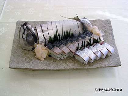 In the days when rice was the best treat, a wide variety of sushi was made to entertain guests. Among them, “Saba no Sugata zushi” (mackerel sushi) is a must for festivals and wedding ceremonies. The mackerel, opened in the back and filled head to tail with sushi rice, is very vigorous. A few decades ago, the day after Okyaku, a small party called “Zan” was held to comfort the people who helped the preparation and cleanup. At that time, they roasted the head and tail of the remaining sugata zushi.