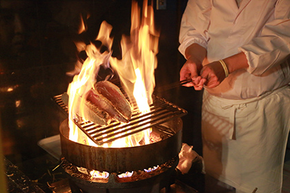Salt the surface of bonito, which has been cut into three slices, roast it with straw, and cut it into thick pieces. Finish with a generous amount of salt or tataki sauce, and as the name implies, “tap” (“tataku” in Japanese) it by hand to blend the flavors. Its wild flavor goes well with ginger, garlic and green onions. Naturally, it is a necessity for sawachi dishes.