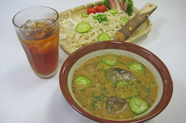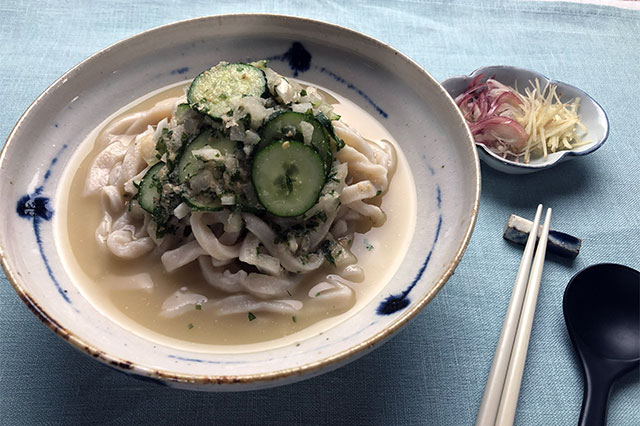 You can also put the soup in a small bowl and put ice in it. (In this way, the soup is diluted only to the extent that it is consumed.) You may add myoga or ginger as condiments. Cucumber may be shredded and served separately.
