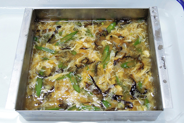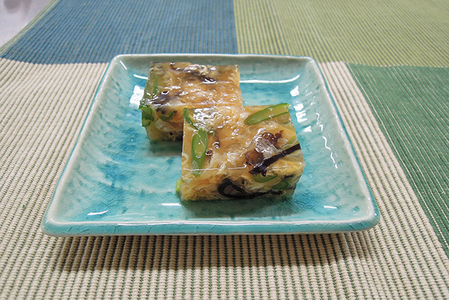 When adding vegetables, scatter them evenly after the egg has hardened from the heat of the agar. In the Okitama area, summer vegetables and lightly seasoned shiitake mushrooms are sometimes added in addition to eggs.