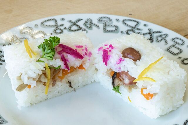 9. Line the box with sushi rice to a depth of 1cm, and lay the wakame seaweed on top. Next, pack with alternating layers of rice, carrots, rice, cucumber, rice, and tinned crab. Place the lid on the box, and weigh it down with a weight.