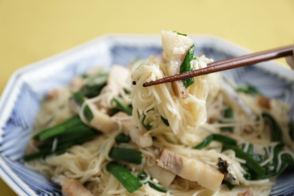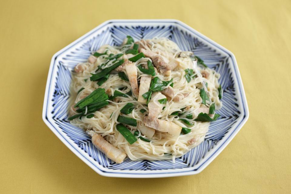 7. Add the dried sardines and boiled somen noodles to the wok and stir-fry them all together.