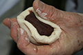 6. Divide the dough into 60g portions and wrap each portion around a ball of sweet red bean paste.