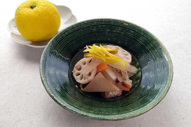 5. Boil the radish, carrot, lotus root, shiitake mushrooms, and deep-fried tofu in shiitake mushroom stock. When they're cooked, drain them in a colander.
