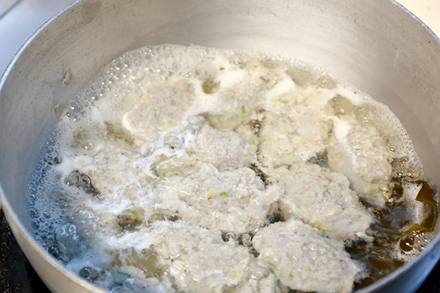 1. Remove the head and entrails from the Okigisu, and pound the fish bones into surimi (fish cake). (You can also use a food processor.)