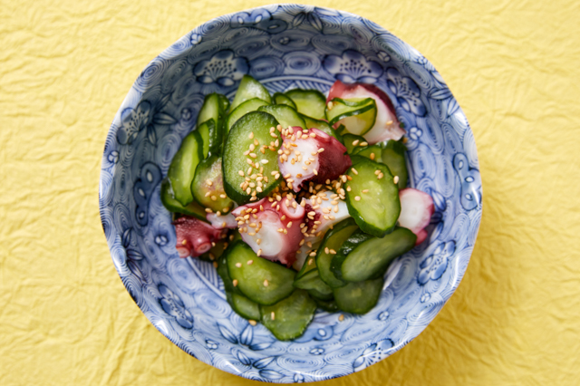 4. Squeeze cucumbers to remove liquid. Add octopus and marinate with Awase-zu.