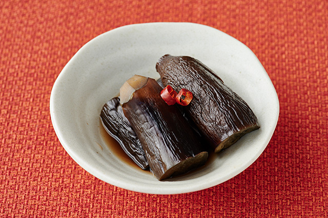 2. Put the seasonings from list [A] in a pan. Once the soup is heated, add the eggplants and finely chopped cayenne pepper. Once the flavors are absorbed, turn off the heat and serve.