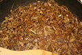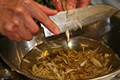 6. Add the Gobou(=Burdock root) to the pan with the chicken meat in it. Cook while stirring.